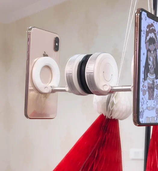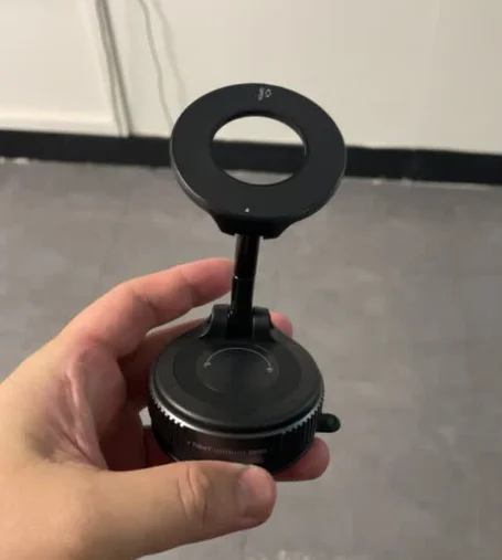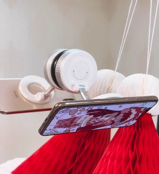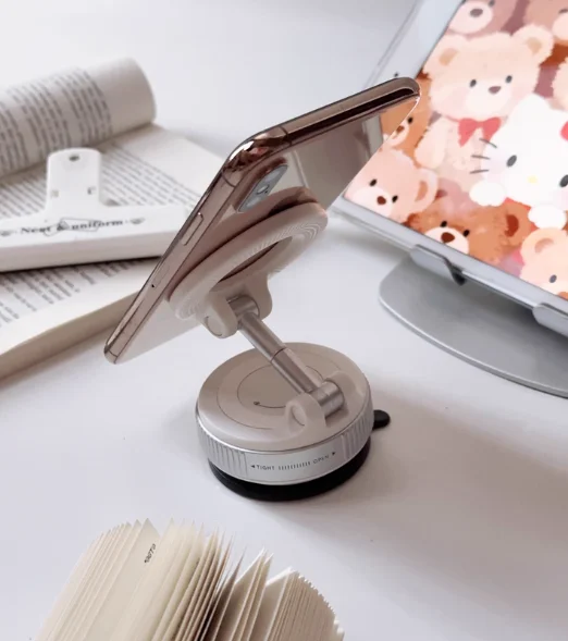 This phone holder uses a vacuum suction mechanism to securely attach to smooth surfaces like car windshields and mirrors. Simply clean the surface, attach the holder, and adjust it to your desired angle.